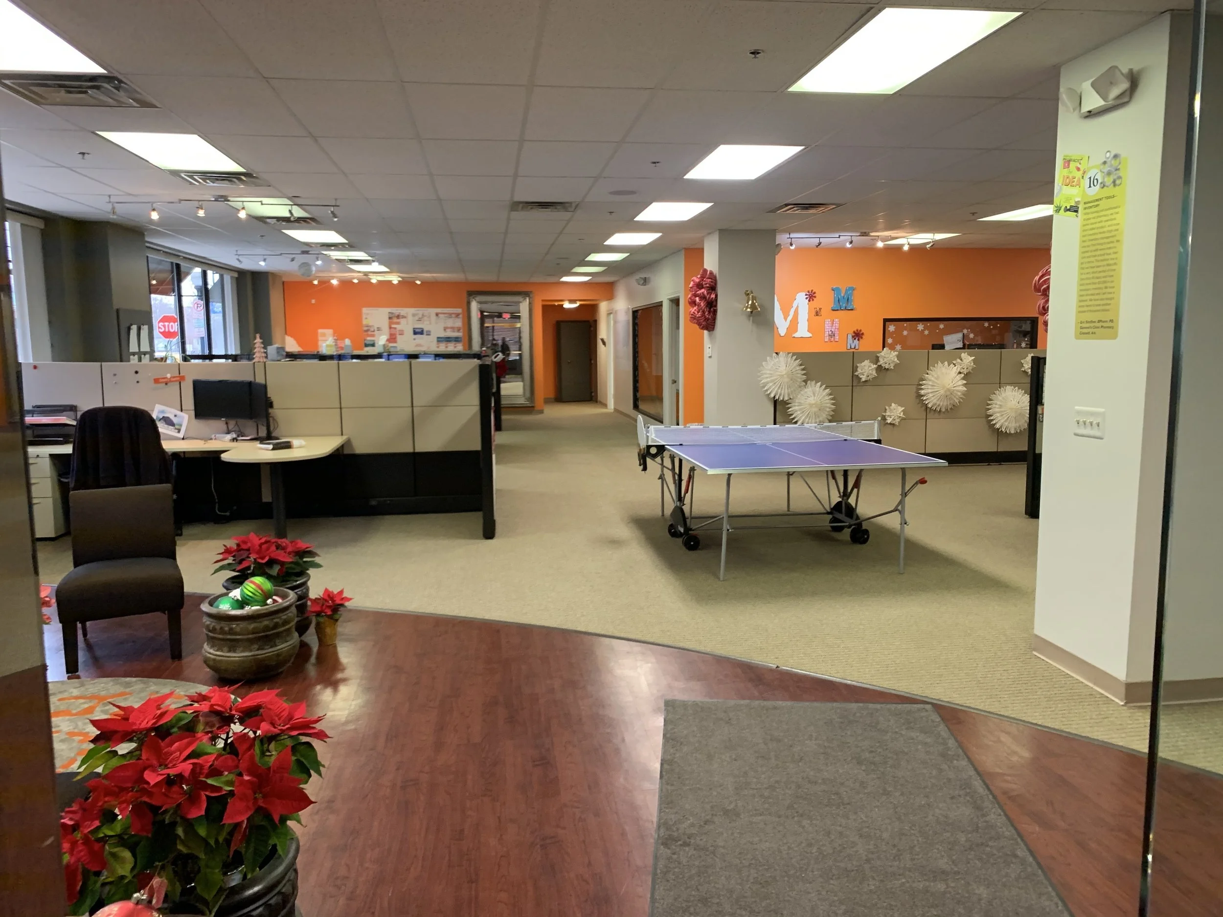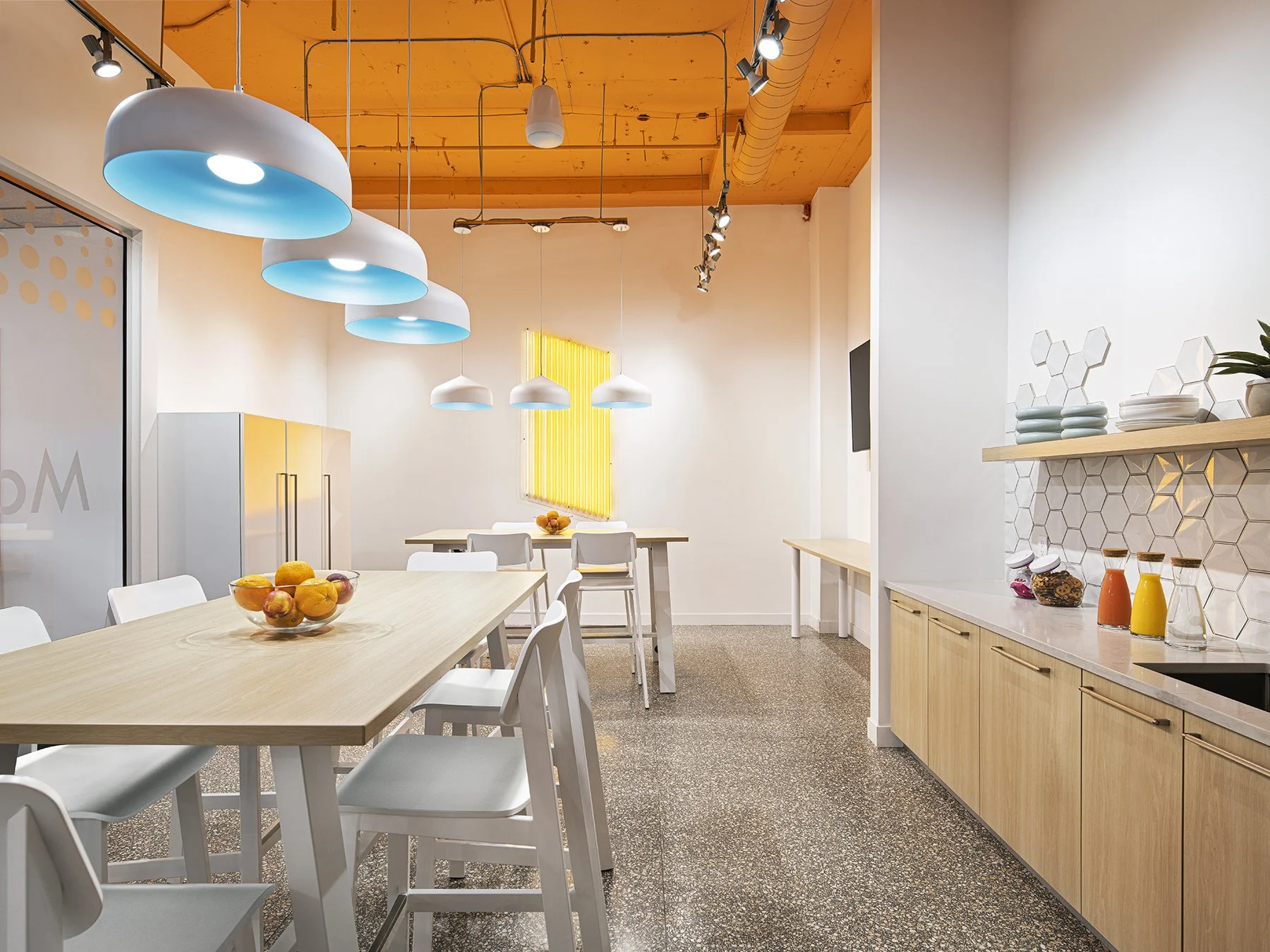 Pops of brand color create a vibrant atmosphere within the pharmaceutical office headquarters. The e-commerce headquarters boasts custom tilework, custom glasswork, lighting detail, private and common area workspaces, and custom graphic applications.